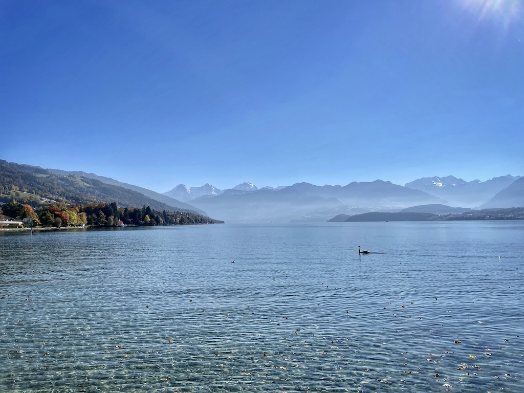 From the park, the view extends clearly toward Lake Thun. On good weather days, the water appears bright and reflective, with boats crossing and the Alps forming a natural backdrop. This point marks the end of the walking route and provides a strong final impression of the city.